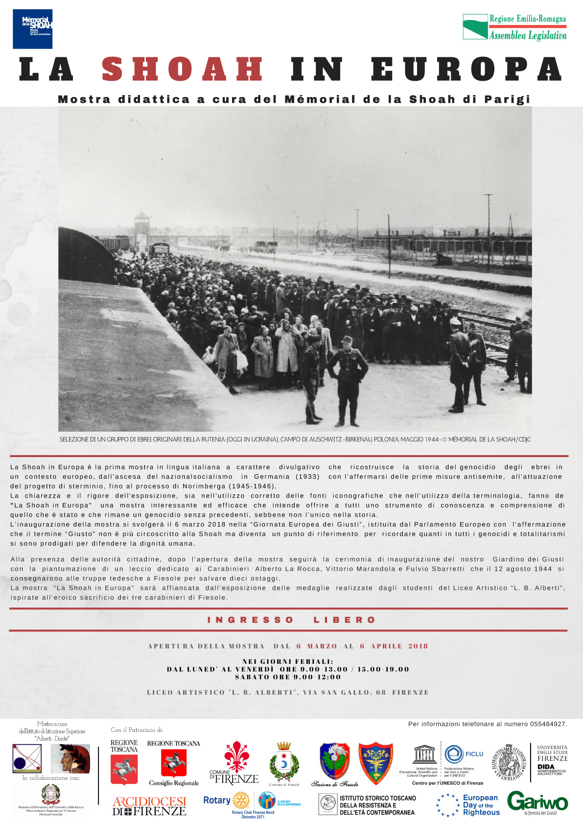 In occasione della Giornata in memoria dei giusti dell’umanità si terrà la cerimonia d’apertura della mostra didattica “La Shoah in Europa”, a cura del Mémorial de la Shoah di Parigi. La mostra rimarrà aperta dal 6 marzo al 6 aprile 2018.