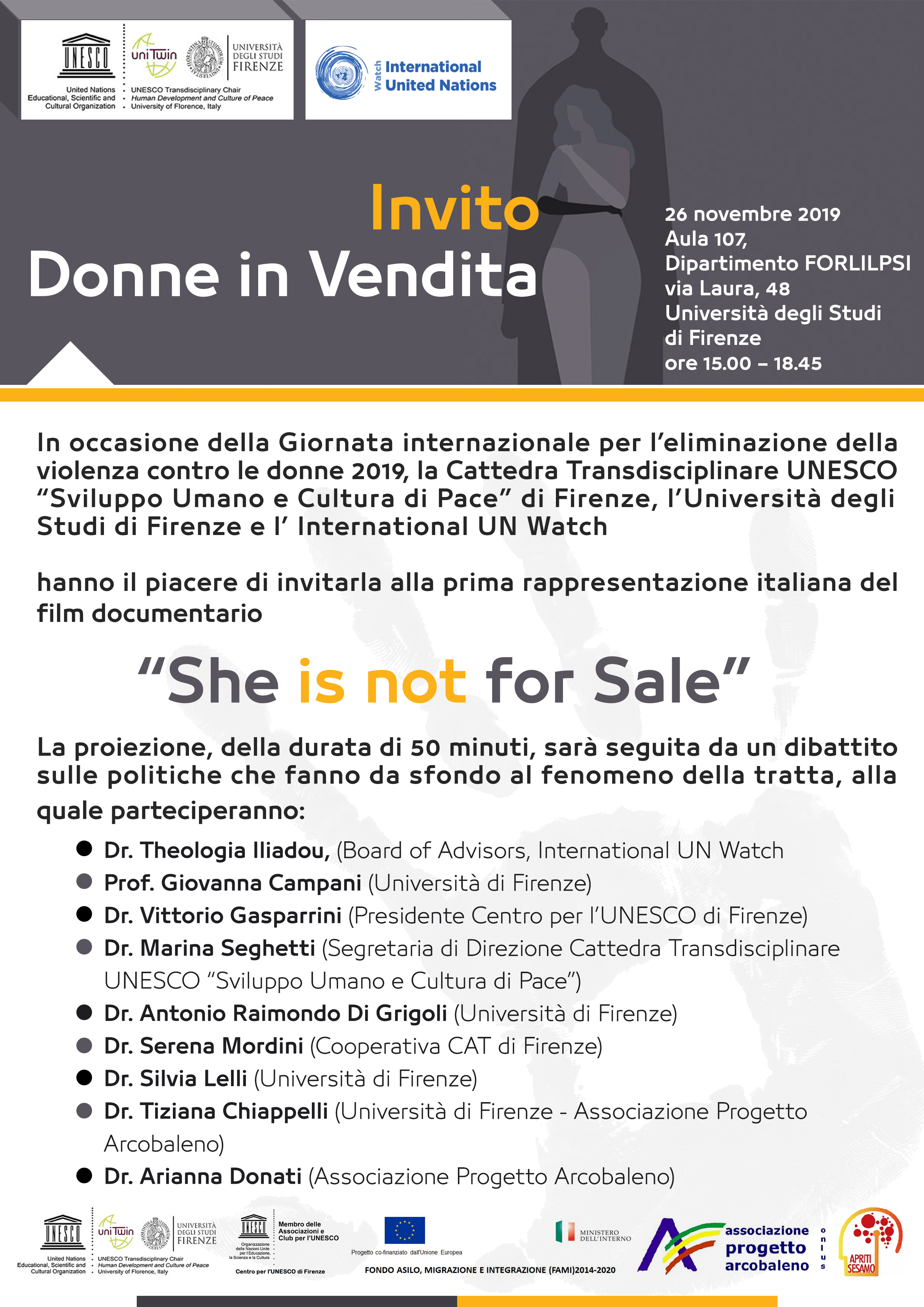 Evento organizzato dalla Cattedra Transdisciplinare UNESCO “Sviluppo imano e cultura di pace” di Firenze, dall’Università degli Studi di Firenze e da International UN Watch in occasione della Giornata internazionale per l’eliminazione della violenza contro le donne. La proiezione sarà seguita da un dibattito sulle politiche che fanno da sfondo al fenomeno della tratta delle donne.
